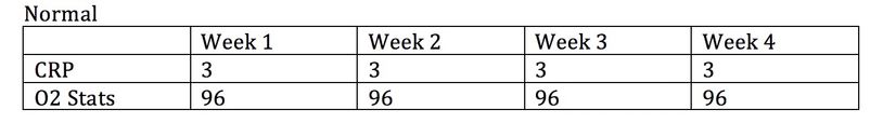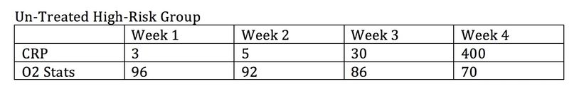 In typical high-risk patient CRP begins with a normal level of 3 increasing to 30 and up to 450 with an associated lung dysfunction 02 stats beginning at normal 96 and falling. O2 stats of 89 is pulmonary failure, requiring admission with ventilatory support with mortality increasing to as high as 80% as lung failure progresses. The typical high-risk patient can expect a 50% hospitalization rate with a 30% mortality. Most of the risk begins with an O2 stat of 89.