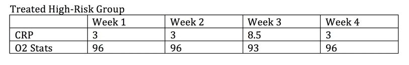 Patients are non-randomly chosen to the low-risk and high-risk groups. Each group randomly assigned to treatment and no treatment. Serial CRP’s and O2 stats are measured through out the clinical course as are percentage of endpoints at the end.